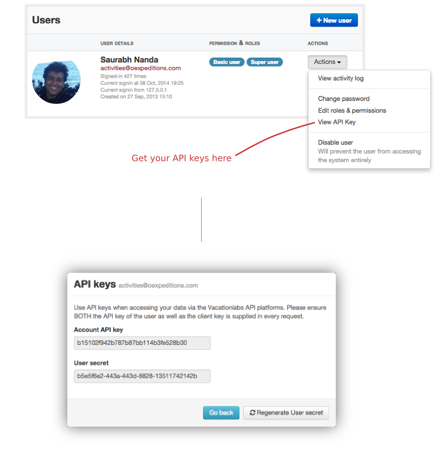 NOTE: All API operations MUST provide Account API key and User secret. These can be obtained by the account owner/super-user from the Vacation Labs backoffice (Settings → Users & Permissions → Against any user click the "Actions" buttons → View API key).